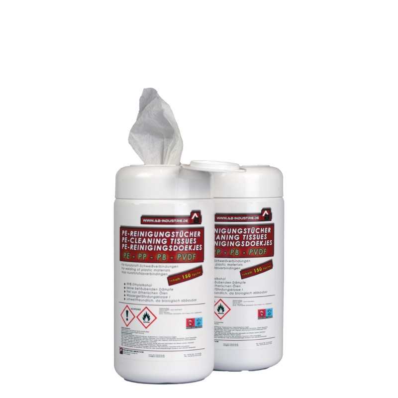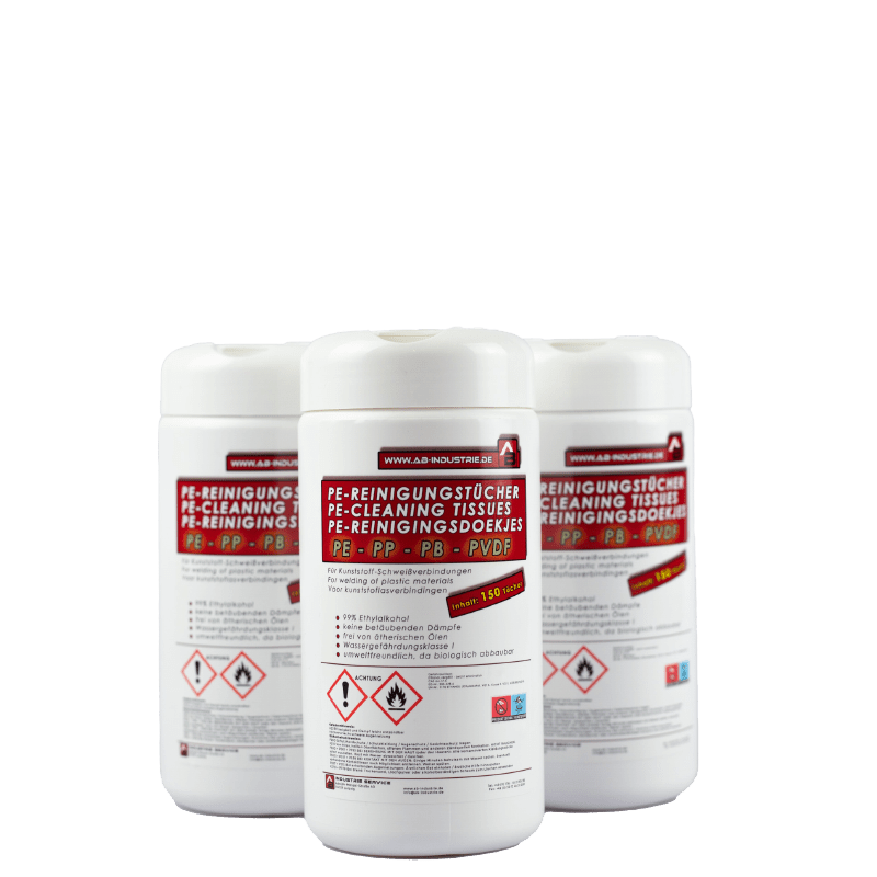 Die zur Verschweißung vorbereiteten Kunststoffteile werden mit dem PE-Reiniger gereinigt. Es wird ein fusselfreies, saugfähiges Papiertuch benötigt, um die Schweißflächen damit gründlich zu säubern. Bei den Reinigungstüchern entfällt die Notwendigkeit eines separaten Tuches.