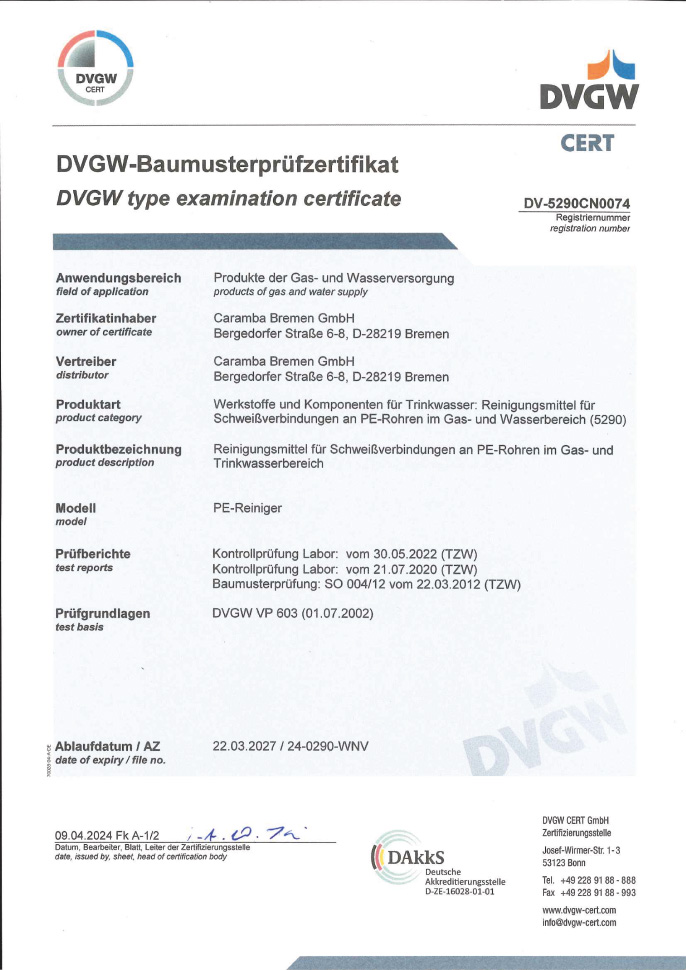 Unser Produkt, hergestellt von Caramba Bremen GmbH, erfüllt alle Anforderungen der DVGW VP 603.